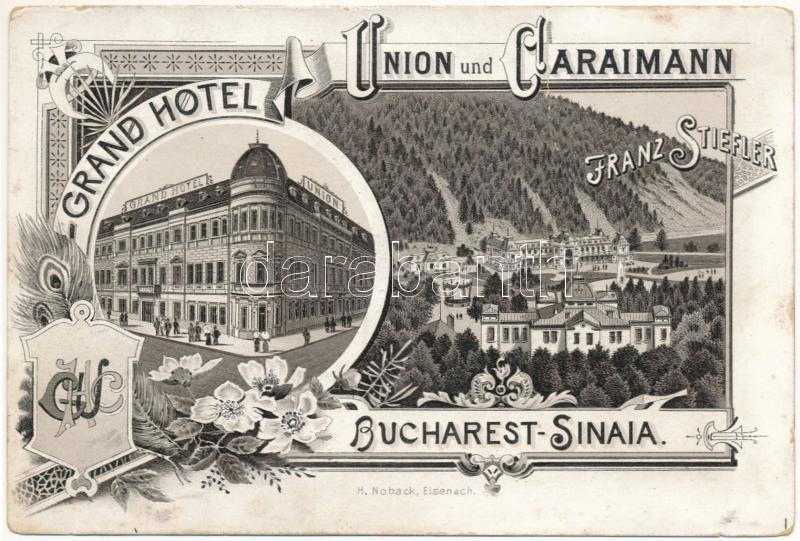 Bucharest, Bukarest, Bucuresti, Bucuresci; Grand Hotel Union und Caraimann, Franz Stiefler, Bucharest-Sinaia. H. Noback Art Nouveau, floral, litho (non PC) (fa)