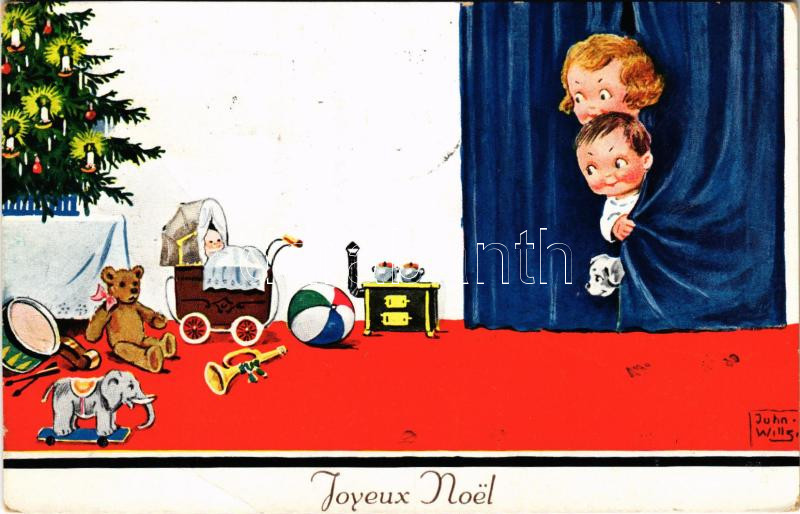 Leírás: 1932 Joyeux Noel / Christmas greeting art postcard with children and toys, teddy bear. WSSB 8970. s: John Wills (EB)