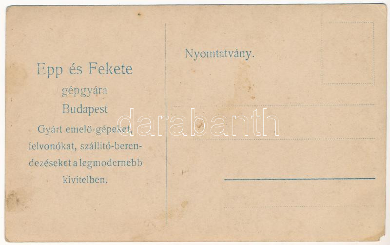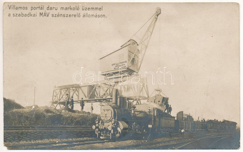 Szabadka, Subotica; MÁV szénszerelő állomás, villamos portál daru markoló üzemmel a vasútállomáson, gőzmozdony, vonat. Epp és Fekete budapesti gépgyár reklám a hátoldalon / coaling station at the railway station, electric gantry crane, locomotive, train. Machine factory advertisement on the backside (EM)