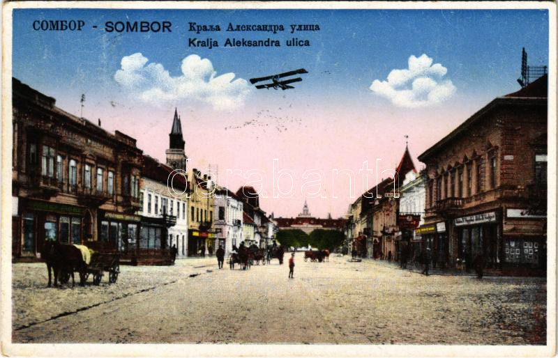 Zombor, Sombor; Kralja Aleksandra ulica / utca fölött egy repülőgép / ... https://www.darabanth.com/hu/429-Gyorsarveres/429.0/Kepeslapok/Vajdasag~1500010/Zombor-Sombor-Kralja-Aleksandra-ulica-utca-folott-egy-repulogep-street-shops-aircraft-plus~II2752977