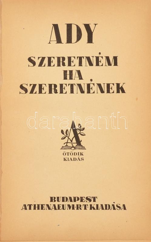 Ady Endre: Szeretném ha szeretnének + Halottak élén. Bp., Athenaeum. K... https://www.darabanth.com/hu/429-Gyorsarveres/429.0/Konyvek/Konyvek-Egyeb-ritkasagok~1000026/Ady-Endre-Szeretnem-ha-szeretnenek-plus-Halottak-elen-Bp-Athenaeum-Kiadoi-egeszvaszon-kotC3~II2712969