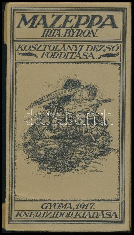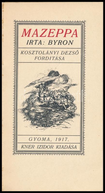 Byron: Mazeppa. Ford.: Kosztolányi, Dezső. Gyoma, 1917, Kner Izidor, 44+2 p. Első kiadás. A címlapot Divéky József (1887-1951) rajzolta. Kiadói papírkötés, a gerincen sérülésnyomokkal.