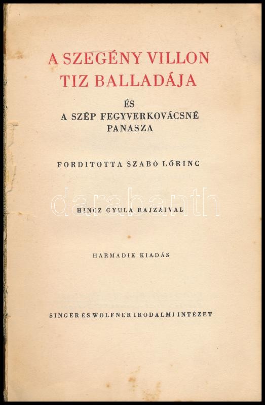 Francois Villon: A szegény Villon tíz balladája és szép fegyverkovácsné panasza. Ford.: Szabó Lőrinc. Hincz Gyula (1904-1986) lapszámozáson belüli 18 egészoldalas rajzával. Bp., 1940, Singer és Wolfner,(Hungária-ny.), 71 p. Harmadik kiadás. Kiadói félvászon-kötés, kopott, foltos borítóval, kissé sérült gerinccel, hiányzó szennylapokkal, laza kötéssel, kissé foltos lapokkal.