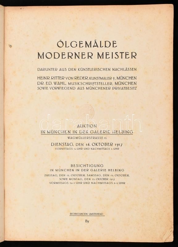 1917 Ölgemälde Moderner Meister. Auktion in München in der Galerie Helbing. Papírkötés, kissé sérült gerinccel.;