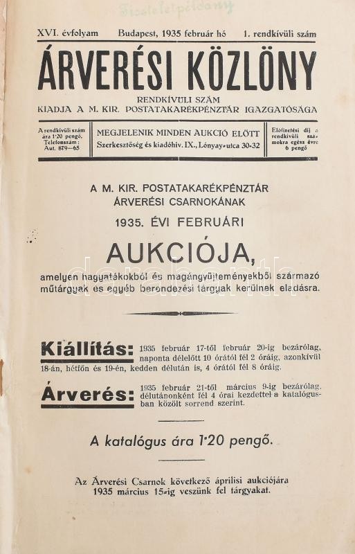 1935 Árverési Közlöny XVI. évf. 1. rendkívüli szám, 1935. február. Szerk.: Kolossyváry Miklós. Bp., 1935., Stádium-ny. Kiadói papírkötés, kissé kopott borítóval, kissé foltos lapokkal, bejelölésekkel, a borító modern professzionális átlátszó védőfóliában, jó állapotban.