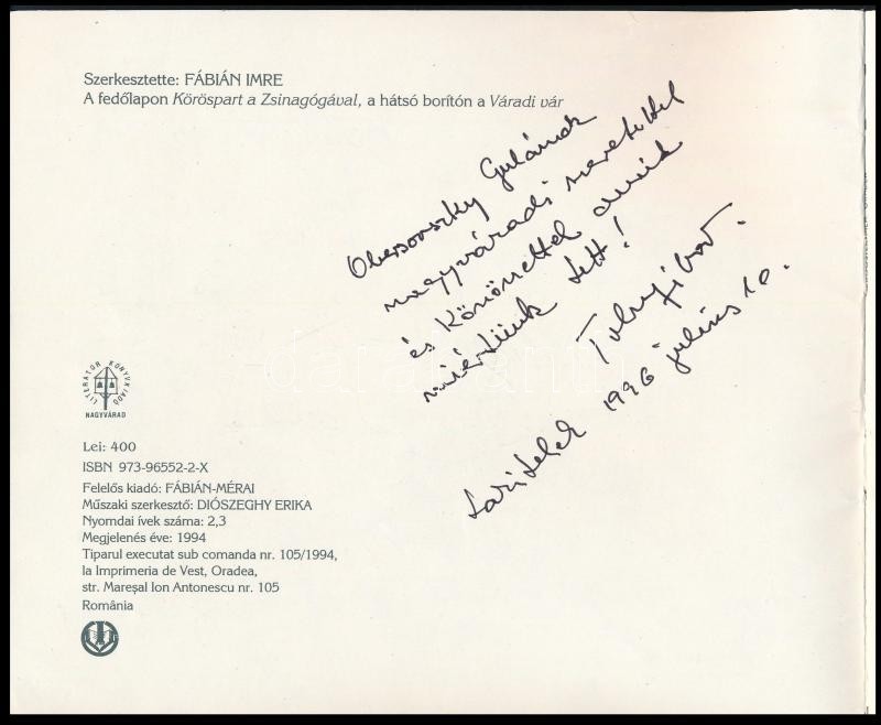Tolnay Tibor: Szerelmem, Várad. Tolnay Tibor (1932-2009) nagyváradi magyar festőművész, grafikus által Obersovszky Gyula (1927-2001) költő, író, újságíró, 1956-os forradalmárnak dedikált katalógus! Nagyvárad, 1994, Literator. Kiadói papírkötés. + 2 db fénymásolat Tolnay Tibor a Vagyok c. lapban megjelent rajzáról.