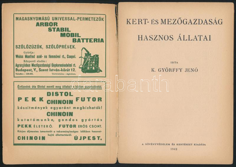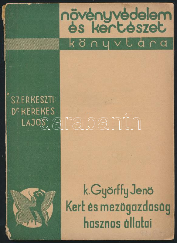K. Györffy Jenő: Kert és mezőgazdaság hasznos állatai. Növényvédelem és Kertészet Könyvtára. Bp., 1942, Növényvédelem és Kertészet, 64 p. Kiadói papírkötés, szakadt borítóval.