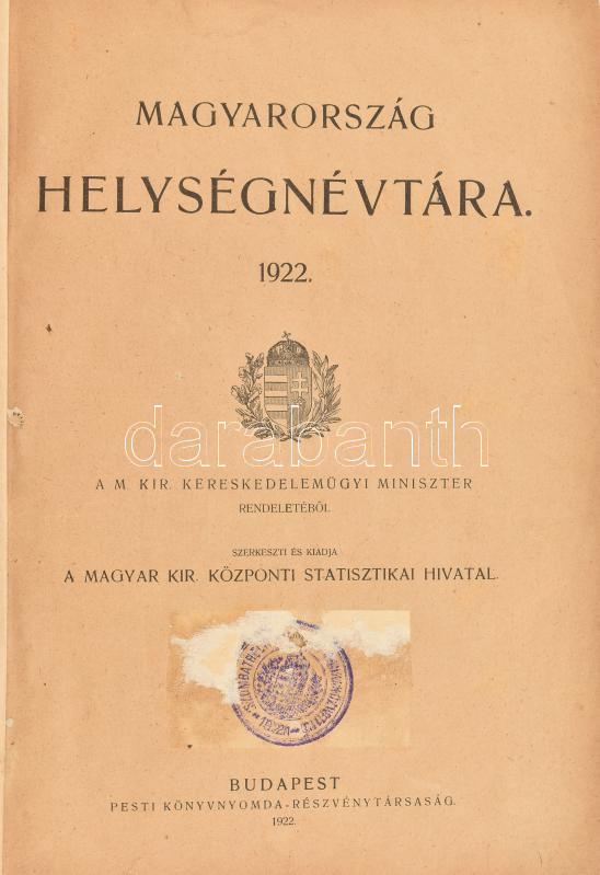 Magyarország helységnévtára. 1922. Szerk.: M. Kir. Központi Statisztikai Hivatal. Bp., 1922., Pesti Könyvnyomda Rt.,IV+147+17 p. Átkötött félvászon-kötés, kissé kopott borítóval, kissé laza fűzéssel.