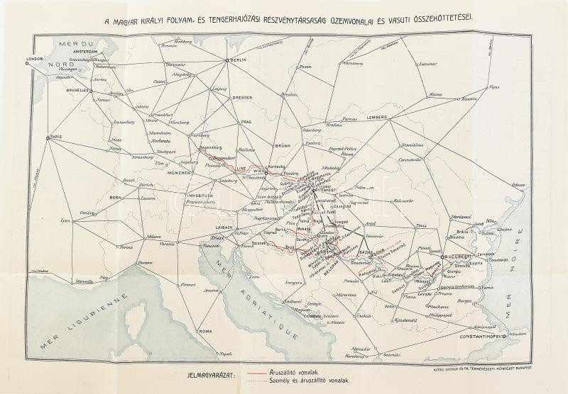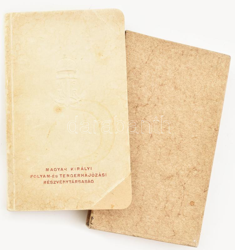 cca 1913 A Duna. H.n., é.n., Magyar Királyi Folyam - és Tengerhajózási Rt. Gazdag szövegközti és egészoldalas képanyaggal, két kihajtható térképpel illusztrált. Korabeli reklámokkal. Kiadói papírkötésben, kartontokban, kissé kopott, kissé foltos borítóval, névbejegyzéssel, és dátumozással (1913. VII/5.)