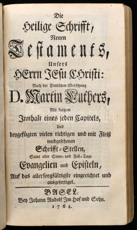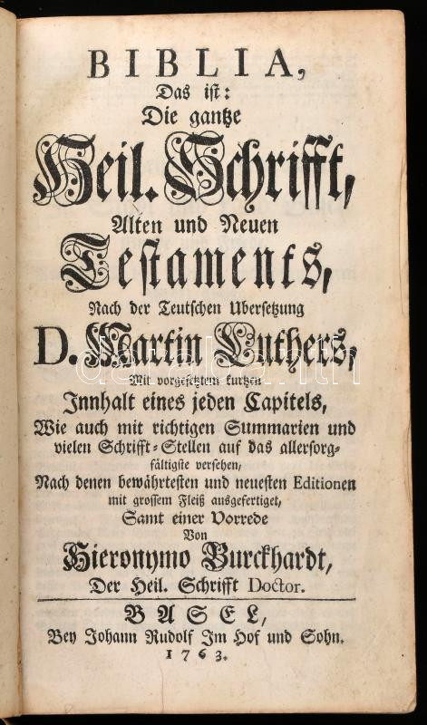 Biblia, Das ist: Die ganze Heilige Schrift des Alten und Neuen Testaments, nach der deutschen Uebersetzung D. Martin Luthers, ... Basel, 1763-1764,Johann Rudolf im Hof,16+909+260 p. Német nyelven. Korabeli egészbőr-kötésben, kopott, sérült, hiányos borítóval, hiányos, az Új testamentum 260. oldalnál végett ér, 265 oldallal lenne teljes.