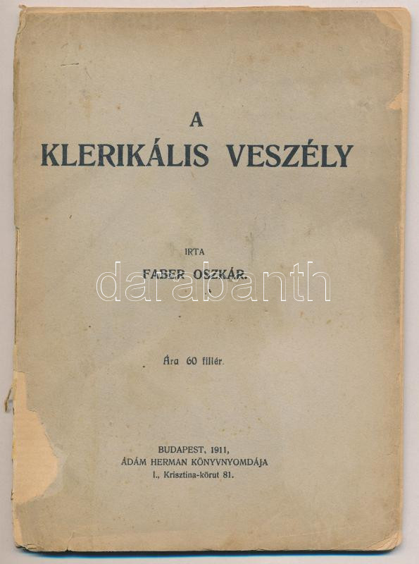 Faber Oszkár: A klerikális veszély. Bp., 1911, Ádám Herman, 56 p. Kiad... https://www.darabanth.com/hu/429-Gyorsarveres/429.0/Konyvek/Konyvek-Vallas~1000022/Faber-Oszkar-A-klerikalis-veszely-Bp-1911-Adam-Herman-56-p-Kiadoi-papirkotes-seru~II2748796