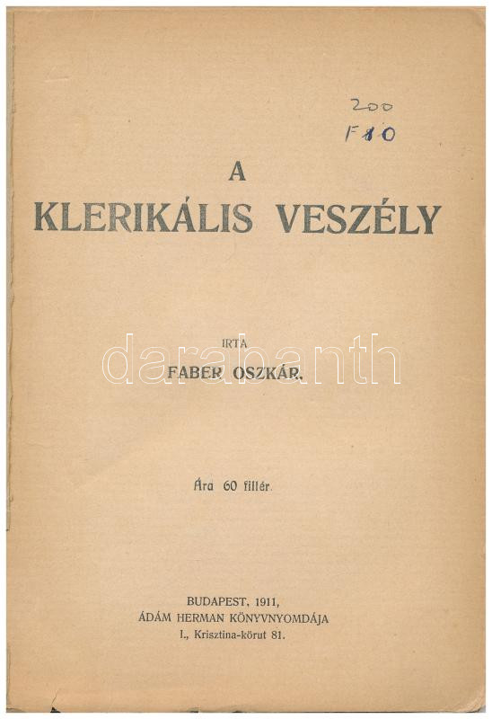 Leírás: Faber Oszkár: A klerikális veszély. Bp., 1911, Ádám Herman, 56 p. Kiadói papírkötés, sérült, hiányos borítóval, helyenként kis lapszéli szakadással, intézményi bélyegzőkkel.