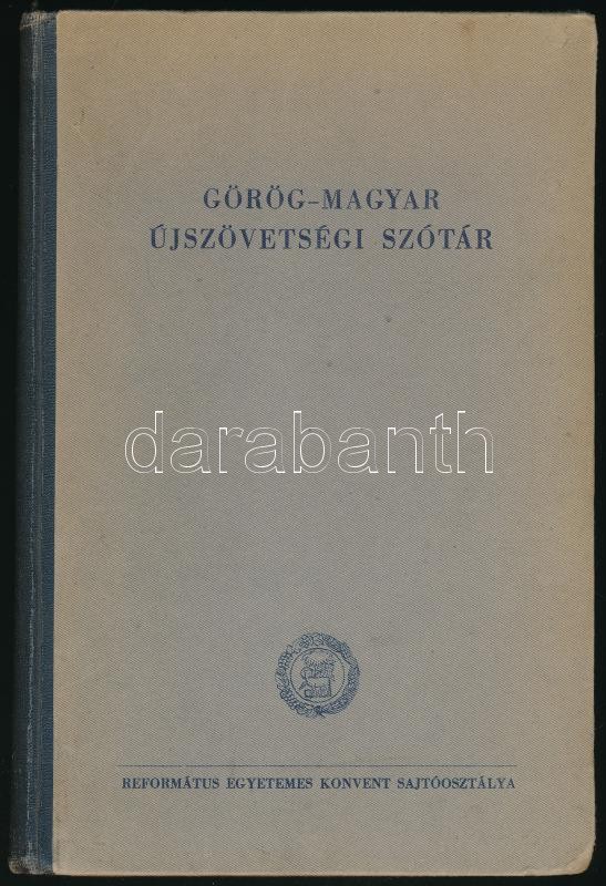 Újszövetségi görög-magyar szótár. Szerk.: Dr. Kiss Jenő. Bp., 1951, Református Egyetemes Konvent Sajtóosztálya. Második kiadás. Kiadói félvászon-kötés, kissé kopott gerinccel.