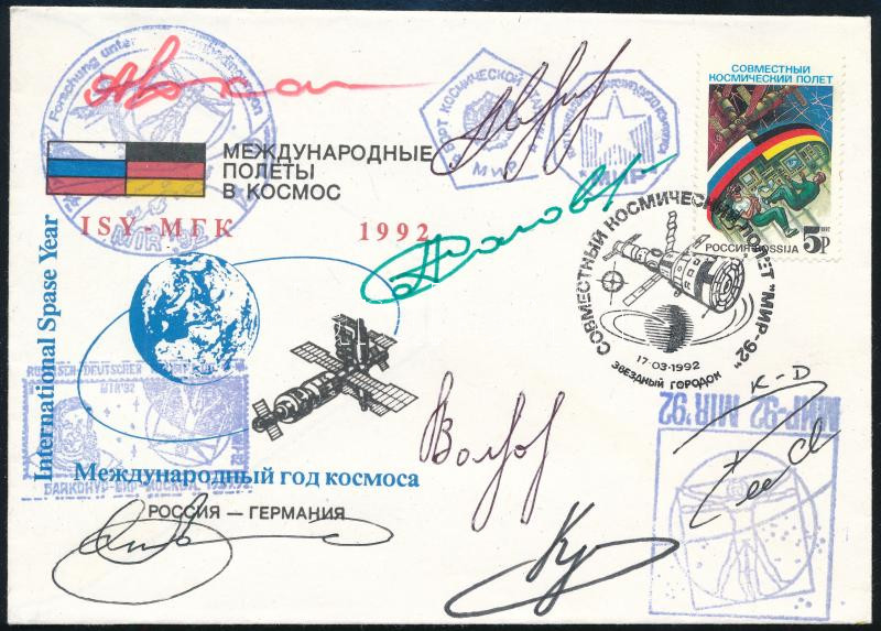 Signatures of Sergei Avdeyev (1956- ), Anatoliy Solovyev (1948- ), Klaus-Dietrich Flade (1952- ) German, Aleksandr Viktorenko (1947- ), Aleksandr Volkov (1948- ) and Sergei Krikalev (1958- )Aleksandr Kaleri (1956- ) Soviet astronauts on envelope