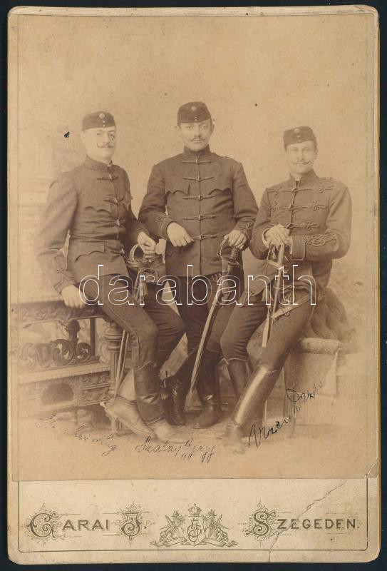 Leírás: 1894 Katonák karddal, műtermi portré, keményhátú fotó feliratozva, Garai Műterméből, karton sérült, 16,5×140,5 cm