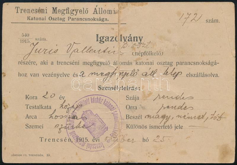 1915.X.25. Trencsén (Trencín, Felvidék), a Trencséni Megfigyelő Állomás Katonai Osztag Parancsnoksága által kiállított igazolvány Juris Vallentin népfölkelő részére, a telepre vezényléséről és ott való elszállásolásáról, "Trencséni megfigyelő állomáson felállított kórház katonai parancsnokság" bélyegzővel. Kisebb foltokkal, hátoldalán ragasztónyomokkal.