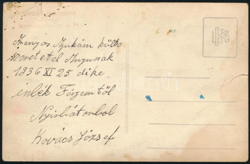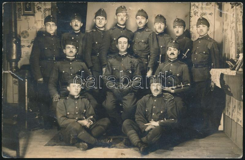 Leírás: 1936.XI.25. Nyírbátor, egyenruhás katonák csoportképe, bajonettekkel, a középen ülő katonán lövészbojttal és zsinórral. Hátoldalán feliratozott, pecséttel jelzett fotólap (Ungár fényképész Nyírbátor), szélén kis szakadással, 13,5x8,5 cm