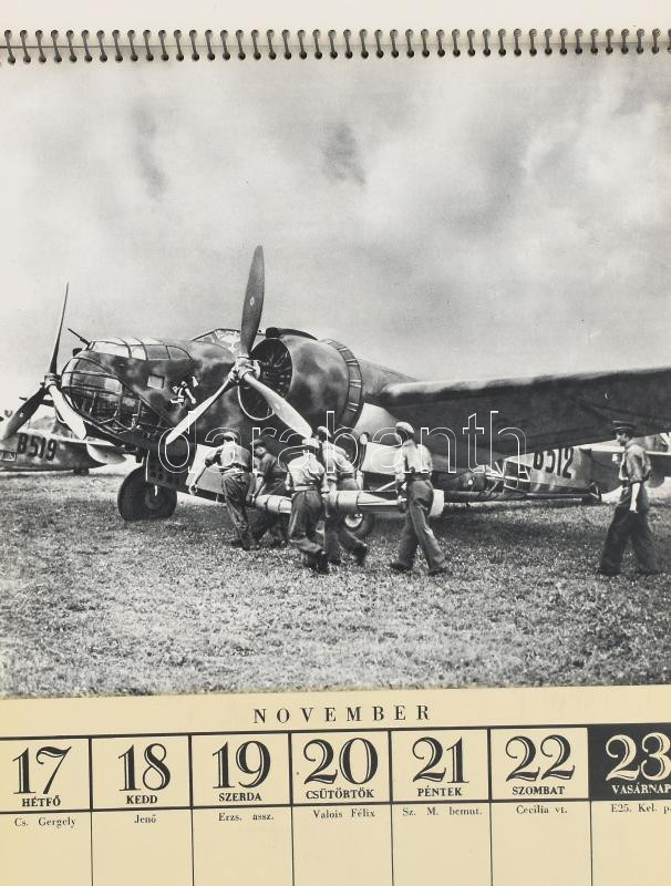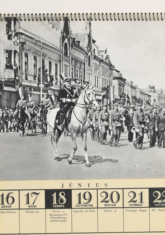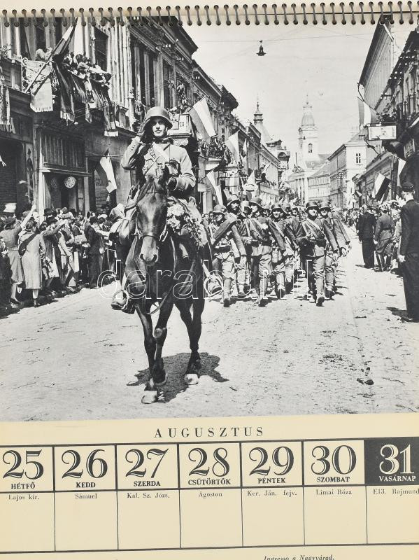 1941 Honvéd naptár heti bontásban, sok katonai képpel, fotóval illusztrált, Horthy lovas portréval, számos képpel az erdélyi bevonulásról (Nagyvárad, Kolozsvár, Marosvásárhely, Szatmárnémeti), csendőrök stb. 24x18 cm. Asztali naptártartóval, jó állapotban