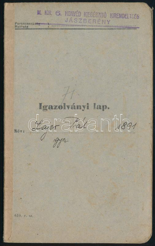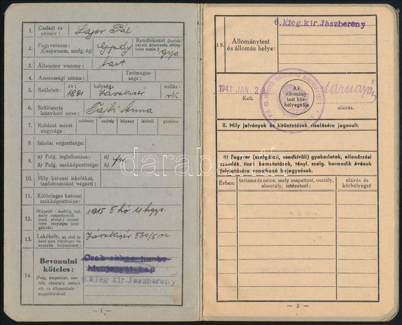 1941 Katonai igazolványi lap, M. Kir. 6. Honvéd Kieg. Kirendeltség Jás... https://www.darabanth.com/hu/429-Gyorsarveres/429.0/Mutargy-papirregiseg-egyeb/Militaria~500029/1941-Katonai-igazolvanyi-lap-M-Kir-6-Honved-Kieg-Kirendeltseg-Jaszbereny~II2754561