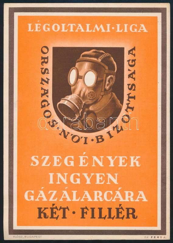1942 Szegények ingyen gázálarca két fillér, a Légoltalmi Liga Országos Női Bizottsága által kiadott plakát, szign. Fery Antal, Klösz Nyomás, szép állapotban, 24×17 cm
