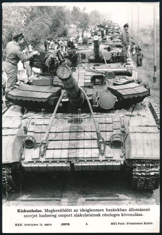 1990 Kiskunhalas, a Magyarországon állomásozó szovjet csapatok kivonulása (T-72 harckocsik menetoszlopban), MTI sajtófotó, Friedmann Endre felvétele, 26,5x18,5 cm