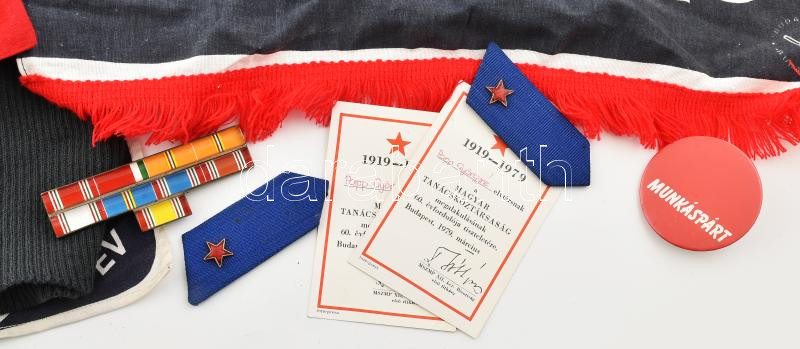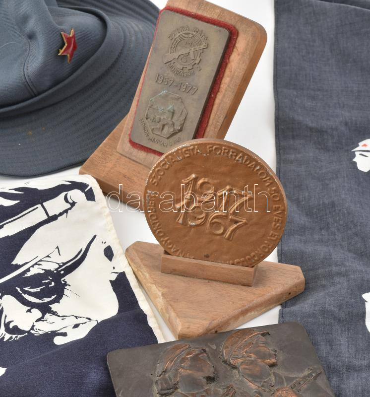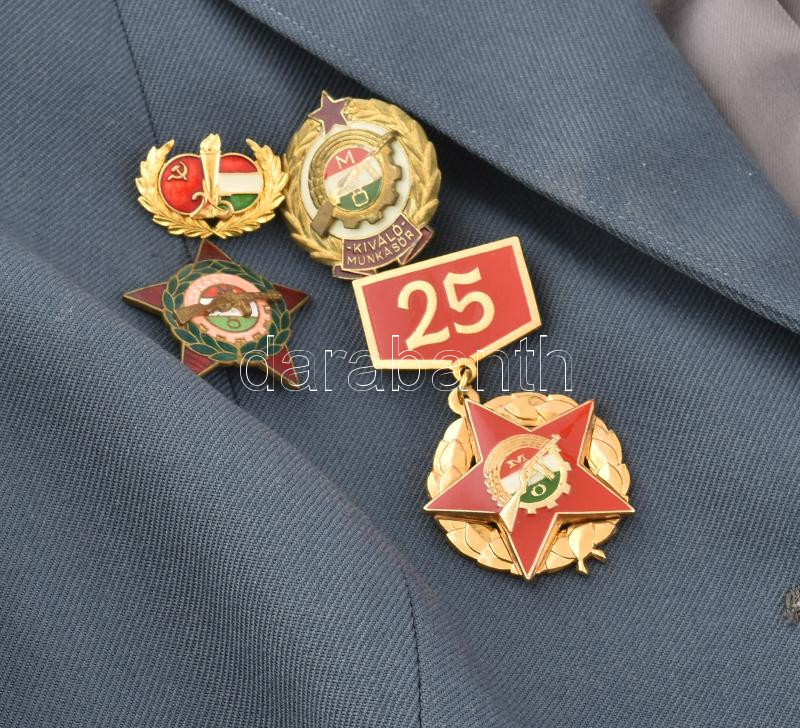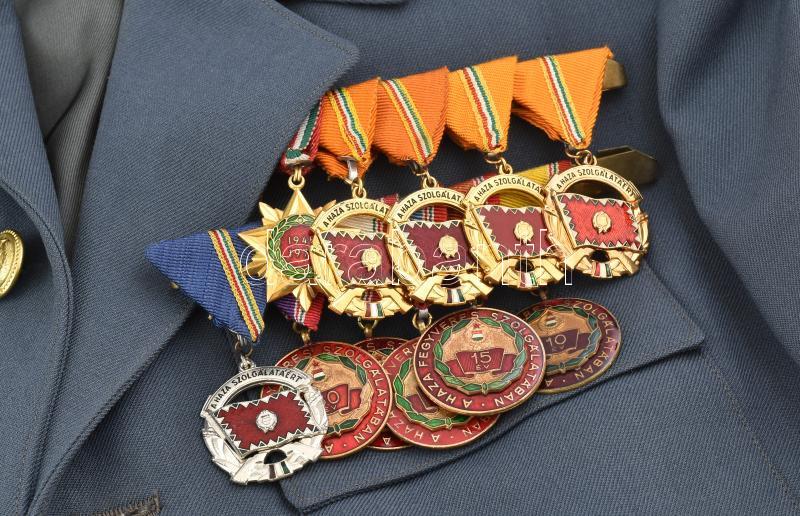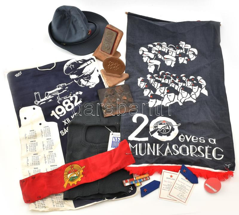 Leírás: Munkásőr csoportvezető főtiszt komplett hagyatéka: Egyenruhák, gyakorló és díszzubbonyok, gyakorló sapka, karszalag, kendők, kitüntetésekkel: Felszabadulás emlékérem, "Kiváló Munkásőr", "Kiváló (Munkásőr) Parancsnok", Munkásőr - 10-25 év jubileumi kitüntetések többek között. Munkásőr emléktárgyak: jubileumi plakettek. valamint a munkásőr tisztet ábrázoló olajfestmény. Takács jelzéssel: 48x60 cm, keretben.