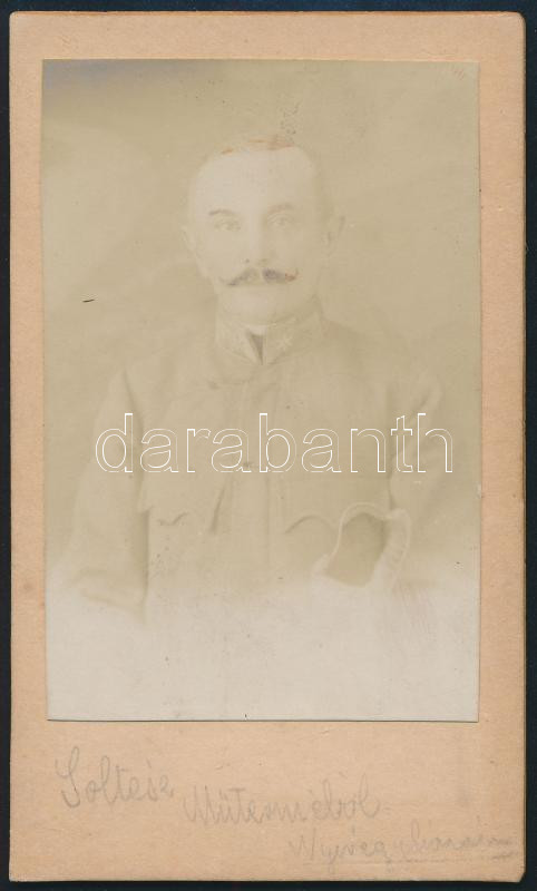 Leírás: cca 1915 Katonaportré, keményhátú fotó Soltész nyíregyházai műterméből, 10,5×6,5 cm
