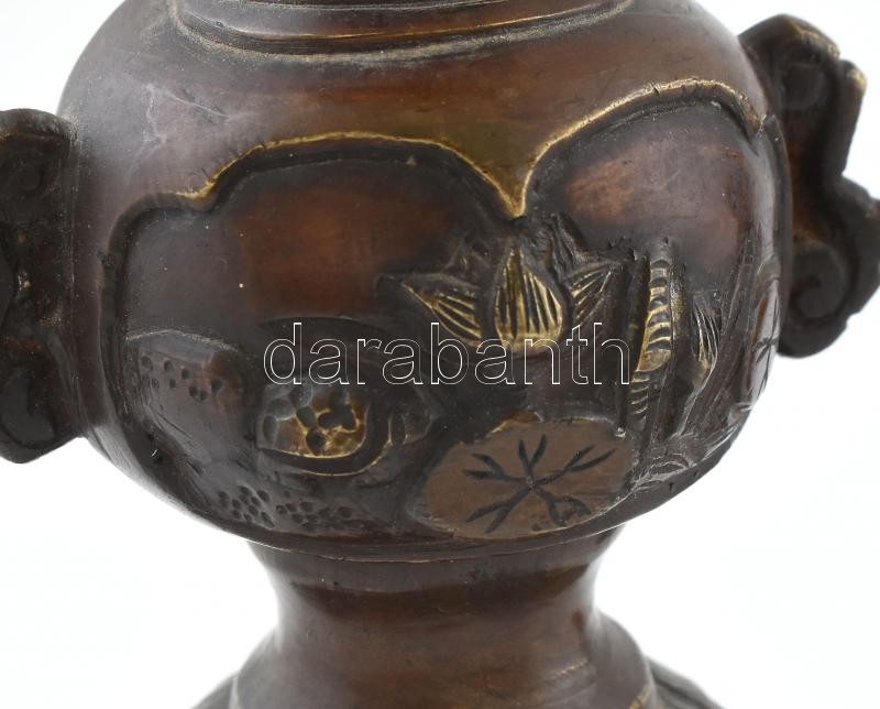 Leírás: 1900 körül, Japán bronz gyertyatartó pár, kopásnyomokkal, m: 21 cm