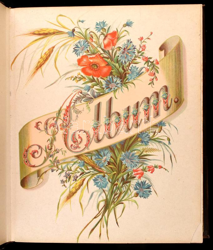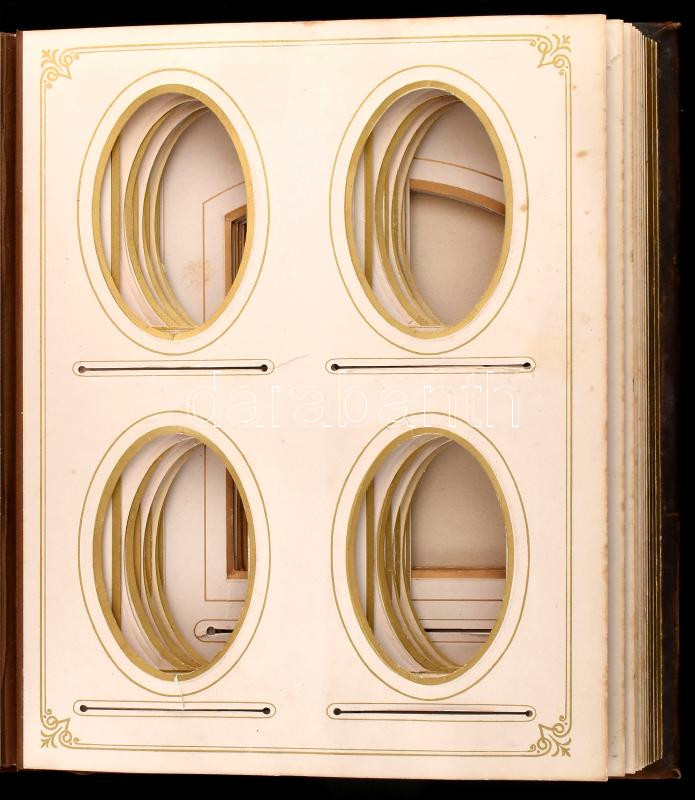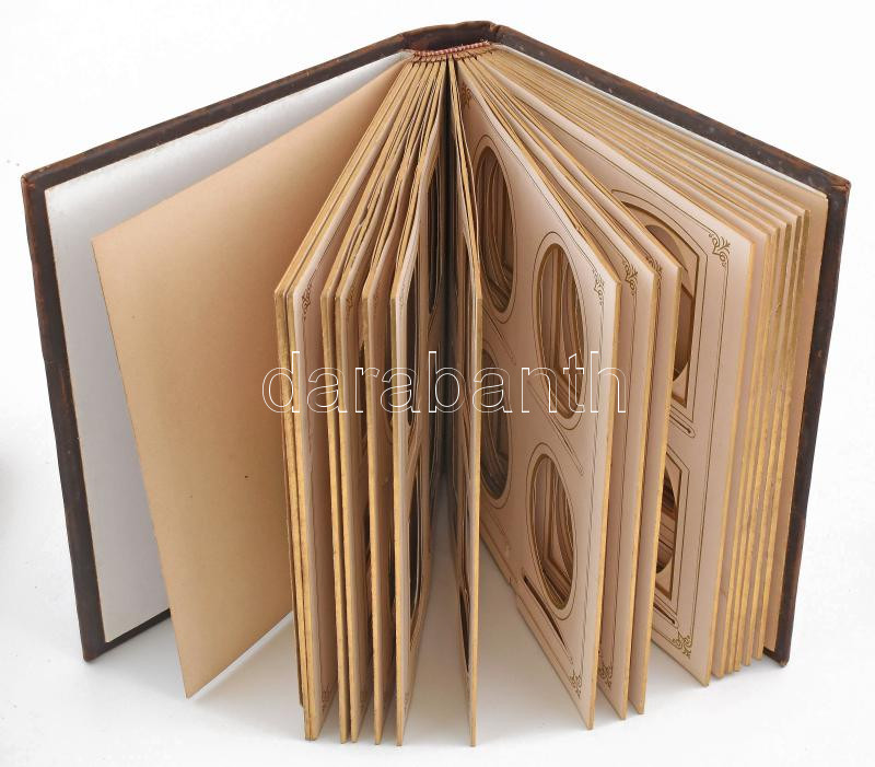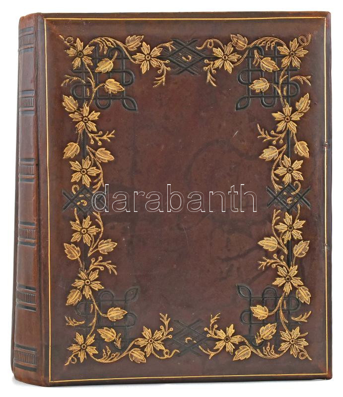 Antik fényképalbum, aranyszínű florális ornamentikával díszített bőrkötésben, aranyozott lapélekkel, 1890-1900 körül. Kissé kopott, fotók nélkül, albumlapok részben sérültek. 27x212x5 cm