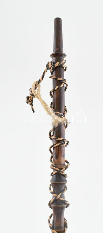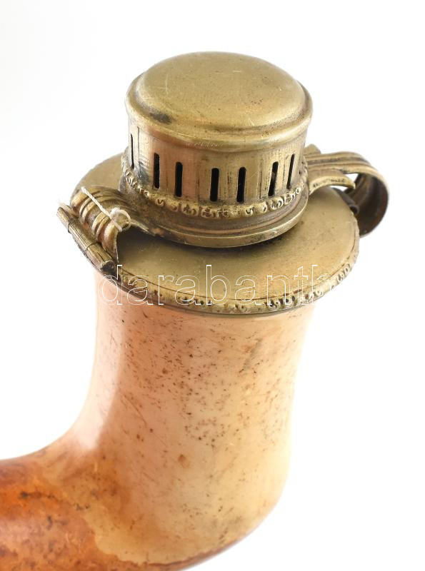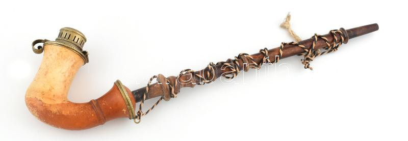 Leírás: Antik tajtékpipa, fa szárral, jelzett (JHNS) alpakka szerelékkel. Korának megfelelő állapotban, h: 36 cm