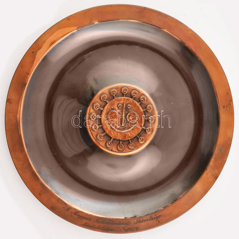 Leírás: Kopcsányi Ottó (1933-2016): réz iparművész napocskás dísz tányér. Jelzett d: 28 cm