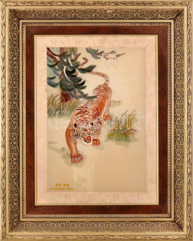 Tigris. Selyem gobelin. Észak-Korea XX. sz. közepe. Üvegezett keretben... https://www.darabanth.com/hu/429-Gyorsarveres/429.0/Mutargy-papirregiseg-egyeb/Mutargyak-antikvitas~500031/Tigris-Selyem-gobelin-Eszak-Korea-XX-sz-kozepe-Uvegezett-keretben-kereten-a-foton-nem-la~II2718701