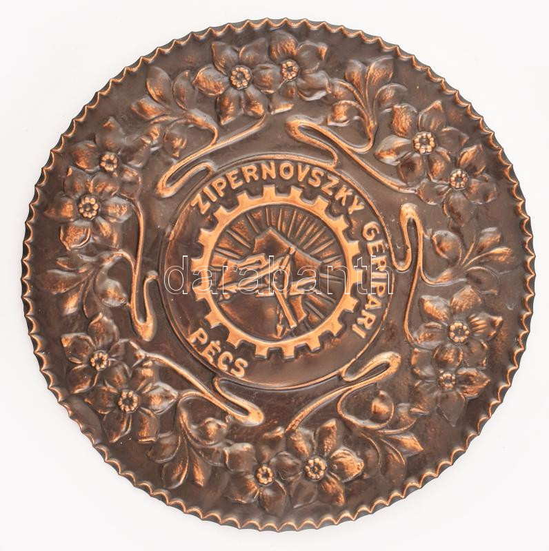 Leírás: "Zipernovszky Gépipari Pécs" (Zipernowsky Károly Műszaki Technikum) retró domborműves vörösréz fali dísztál, jelzés nélkül, d: 27,5 cm