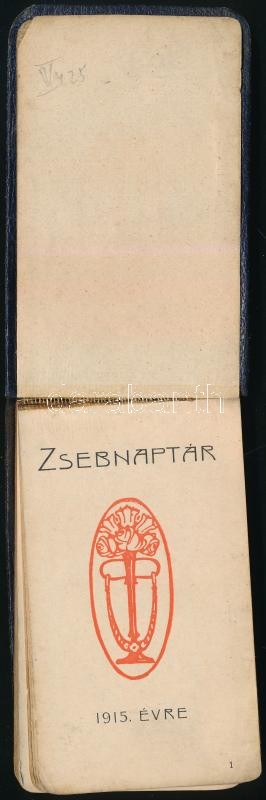 Leírás: 1915 Zsebnaptár az 1915. évre, kopott bőr-kötésben, a gerincen kis lyukkal, ceruzás bejegyzésekkel, 160 p.