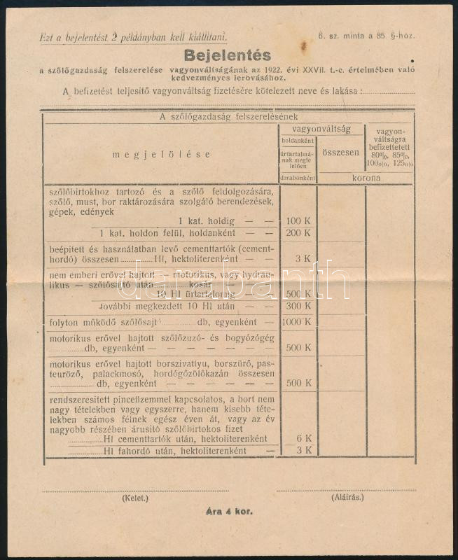 Leírás: 1922 kitöltetlen bejelentőlap szőlőgazdaság felszerelése vagyonváltságának kedvezményes lerovásához, kétoldalas, hajtásnyommal, kis folttal, lapszél apró szakadással, 21x17 cm