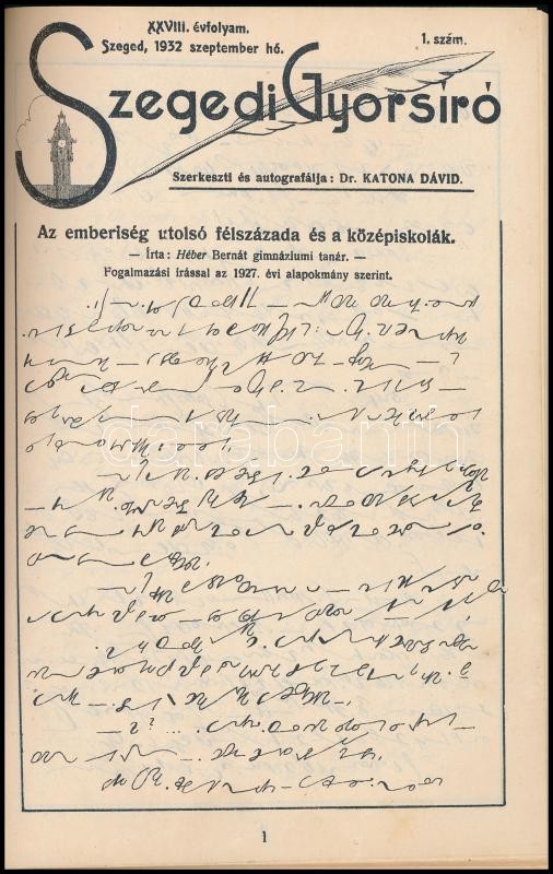 1932-1934 Szegedi gyorsíró. XXVIII. évf. 1-10. sz. 1932. szept-jun. Szerk.: Katona Dávid. + Karaffiáth Jenő: Az egységes magyar gyorsírás alapokmányának kiegészítése és módosítása. A gyorsírás kötelező középiskolai tanítása. "Szegedi Gyorsíró" melléklete.;