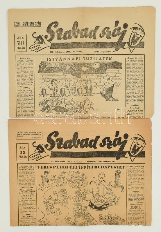 1947-1948 Szabad Száj 2 száma, az egyik szakadt. https://www.darabanth.com/hu/429-Gyorsarveres/429.0/Mutargy-papirregiseg-egyeb/Nyomtatvanyok~1000002/1947-1948-Szabad-Szaj-2-szama-az-egyik-szakadt~II2700240