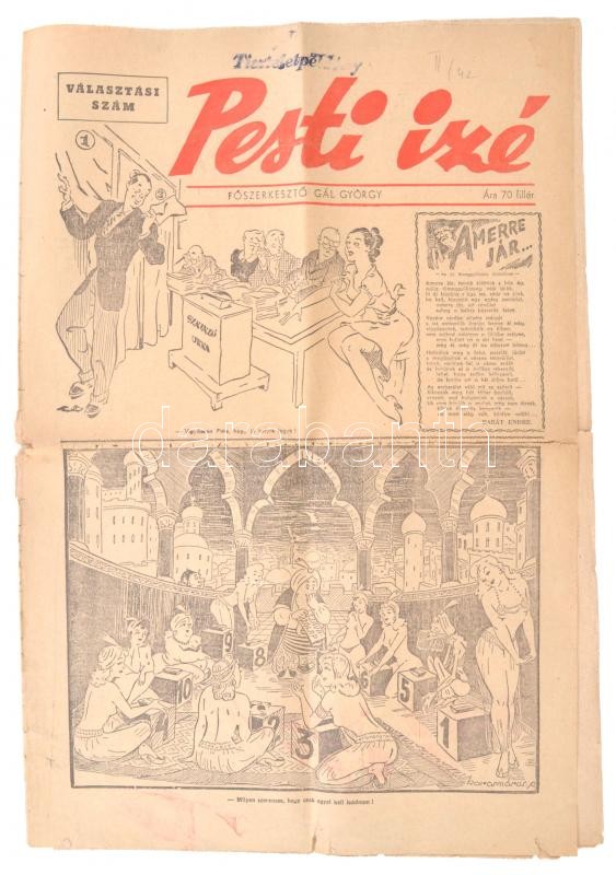 1947 Pesti izé. 1947. aug. 31., 42. szám: Választási szám, szerk.: Gál... https://www.darabanth.com/hu/429-Gyorsarveres/429.0/Mutargy-papirregiseg-egyeb/Nyomtatvanyok~1000002/1947-Pesti-ize-1947-aug-31-42-szam-Valasztasi-szam-szerk-Gal-Gyorgy-szakadt-8-p~II2700895