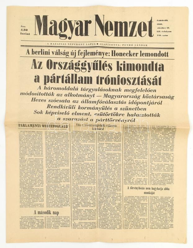 1989 Magyar Nemzet LII. évf. 246. sz., 1989. okt. 1.: "Az Országgyűlés kimondta a pártállam trónfosztását." Szerk.: Soltész István. Bp., Athenaeum, 12 p.