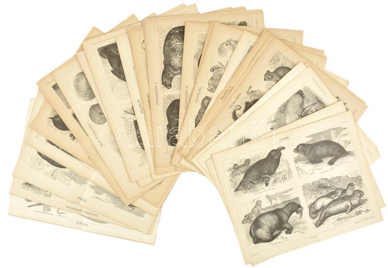 cca 1895 30 db állat témájú (vadászkutyák, szarvasok, sasok, ragadozók, rágcsálók, stb.) és egy viselet témájú nyomat a Pallas Nagy Lexikonából, helyenként apró lapszéli sérülésekkel, 24x31 cm.