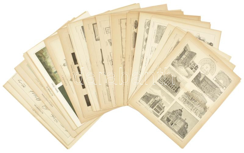 cca 1895 50 db művészet, régészet, építészet, numizmatika témájú (magyar díszítmények, magyar érmek, magyar emlékérmek, magyar ötvösművészet, magyar agyagáruk gyári bélyegei, az ezredéves kiállítás, budapesti épületek stb.) nyomat a Pallas Nagy Lexikonából, 24x31 cm.