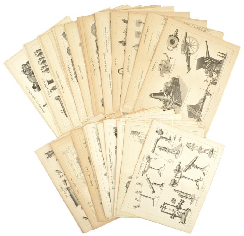 cca 1895 70 db tudomány, technika, vasút és militária témájú (A svábhegyi fogaskerekű vasút Budapesten, függő hidak, erdei vasutak, lokomotívok, lövegek stb.) nyomat a Pallas Nagy Lexikonából, lapszéli kisebb sérülésekkel, 24x31 cm.