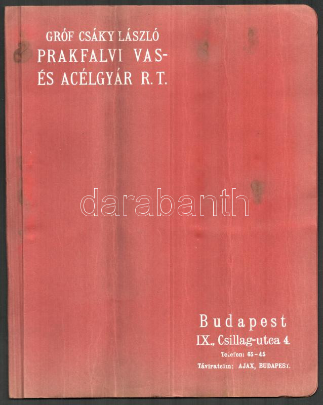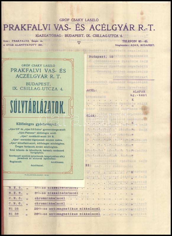 1911 Bp., Gróf Csáky László Prakfalvi Vas- és Acélgyár Rt. súlytábláza... https://www.darabanth.com/hu/429-Gyorsarveres/429.0/Mutargy-papirregiseg-egyeb/Okmanyok~500019/1911-Bp-Grof-Csaky-Laszlo-Prakfalvi-Vas-es-Acelgyar-Rt-sulytablazat-arjegyzek-stb~II2751130