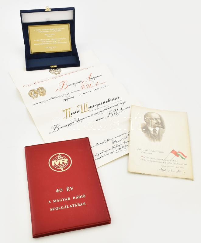 4 db vegyes kitüntetés, elismerő oklevél: 1991 V. I. Lenin Össz-szövetségi Mezőgazdaság-tudományi Akadémia oklevele, orosz nyelvű, kézzel kalligrafált + 1996 40 év a Magyar Rádió szolgálatában emléklap, fém kitűzővel + Gödöllői Premontrei Öregdiákok Egyesülete 30. évfordulós emlékdíj, fém plakett, eredeti dobozban + MSZMP KB 25 éves párttagság oklevél