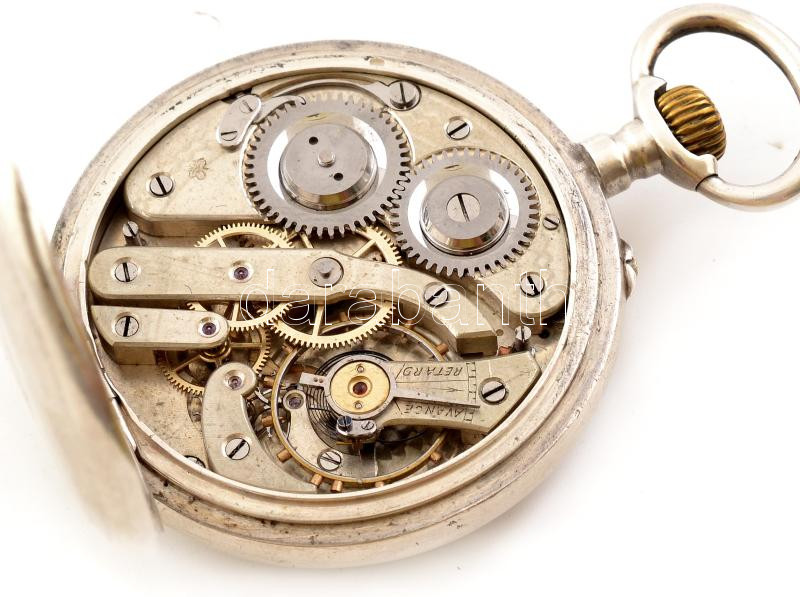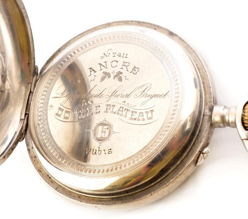 Leírás: Ezüst (Ag) zsebóra dupla ezüst tokkal. Jelzett, működő, jó állapotban d: 50 mm