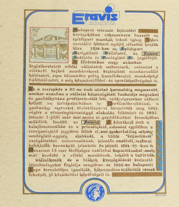 Leírás: 1994 Eravis Szálloda és Vendéglátó Rt., kézzel festett, cégismertető reklámterv, lap széle lyukasztott, 47×38 cm