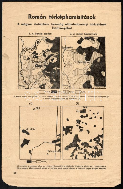 Leírás: Román térképhamisítások, a magyar statisztikai társaság államtudományi intézetének kiadványából, szakadással, 32,5×21 cm