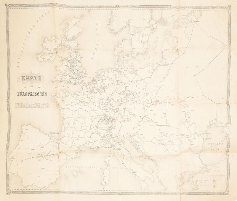 Leírás: cca 1870 Az Európai távíróhálózat térképe 75x100 cm szakadással