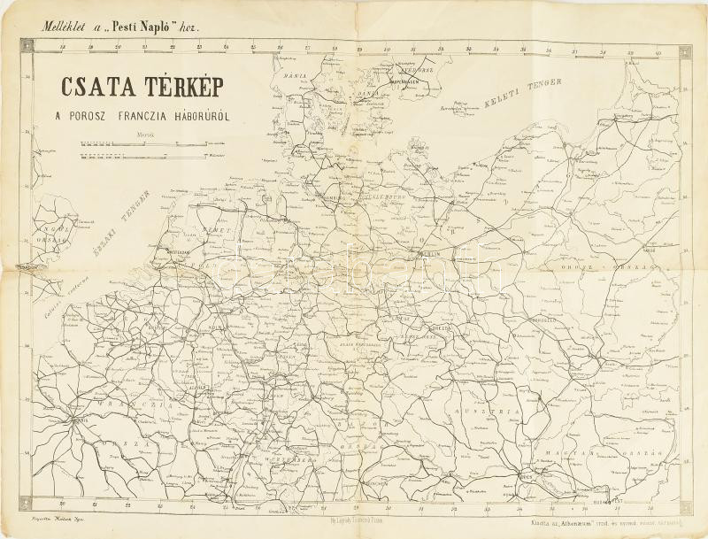 cca 1871 Csata térkép a porosz-francia háborúról. Rajzolta: Hátsek Ignác. Melléklet a "Pesti Napló"-hoz. Az Athenaeum Rt. kiadása. Pest, Légrády-ny. Kis lapszéli sérülésekkel, 57,5x40,5 cm