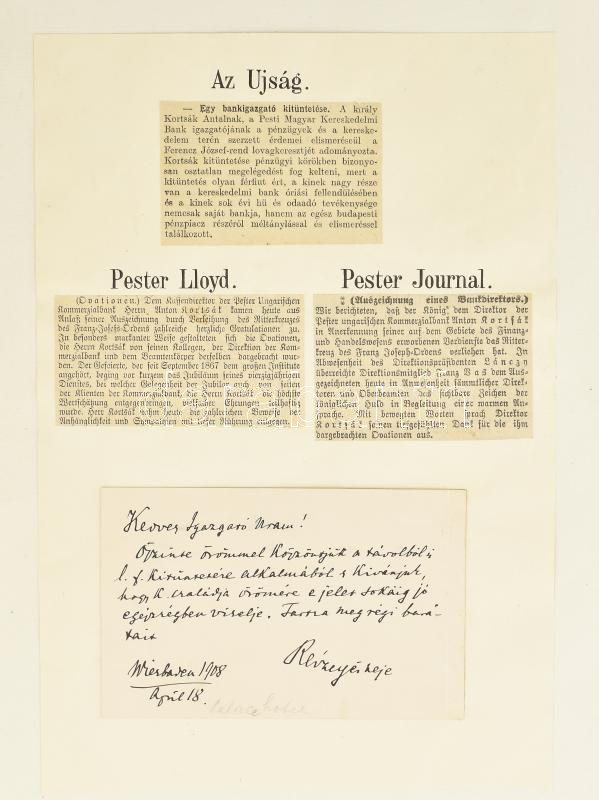 1908 Kortsák Antal a Pesti Magyar Kereskedelmi Bank igazgatójának Ferenc József renddel való kitüntetéséről szóló miniszteri értesítés Wekerle Sándor miniszer autográf alárásával, az esemény alkalmából kapott gratuláló levelek, dedikált névjegykártyák a kor neves ipari és kereksedelmi vezetőitől, igazgatóktól, összesen 33 db névjegy, távirat és képeslap valamint az eseményről beszámoló újságcikk kivágás, és az üdvözlő beszéd.